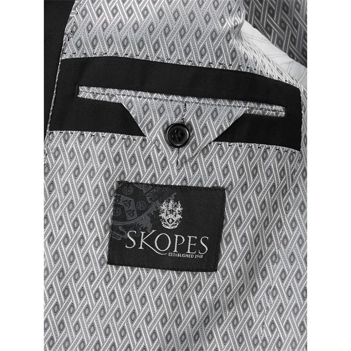 Ronson Tailored Fit Dinner Suit Jacket by Skopes. Made from superfine twill cloth, giving a light weight yet practical and durable feel. Design details include peak lapels, jetted ticket pocket, centre back vent, additional chest darts, contrast colour button hole stitching, Satin trim around pockets and lapels. Available as a two-piece suit with either the matching tailored or slim fit Ronson trousers.