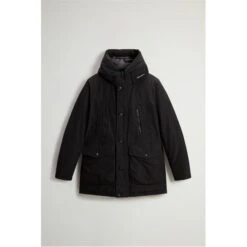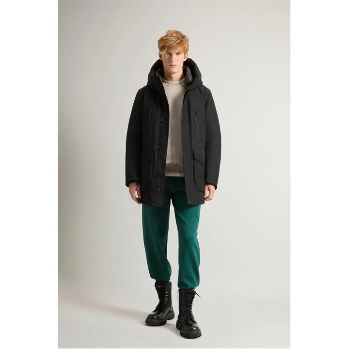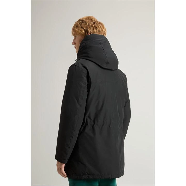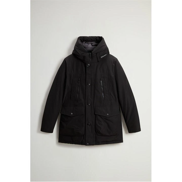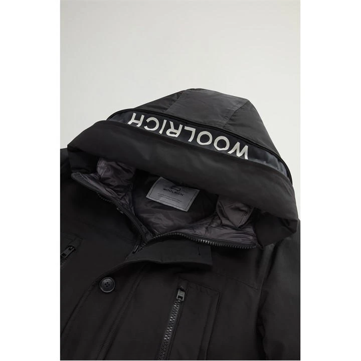 EVOLUTION OF THE ICONIC ARCTIC PARKA MADE WITH RAMAR CLOTH IN 60% COTTON 40% POLYAMIDE, WITH TEFLON FINISHING THAT MAKES IT WATER & WIND RESISTANT. RDS CERTIFIED – 90/10 GREY DUCK DOWN CHEVRON QUILTED INTERIOR HIGH COLLAR WITH THE NEW, BRANDED VELCRO TAB ZIPPED JACQUARD TWILL TAPE ON THE HOOD, TO REVEAL OR HIDE THE WOOLRICH LOGO